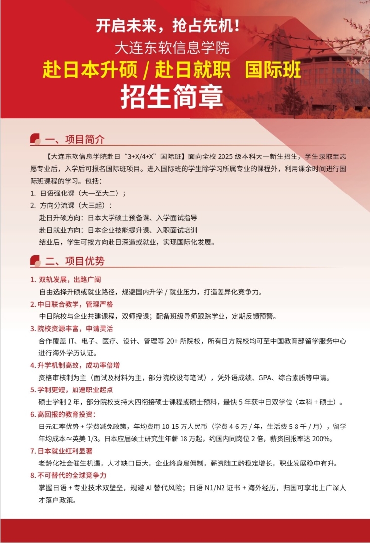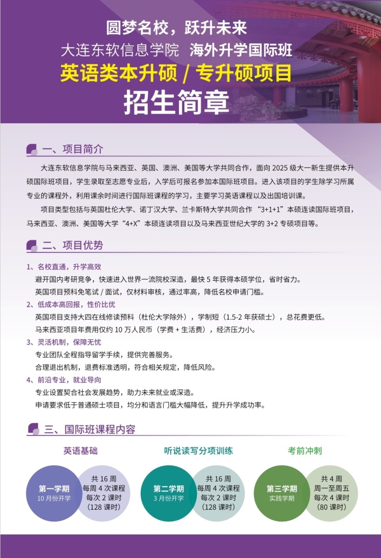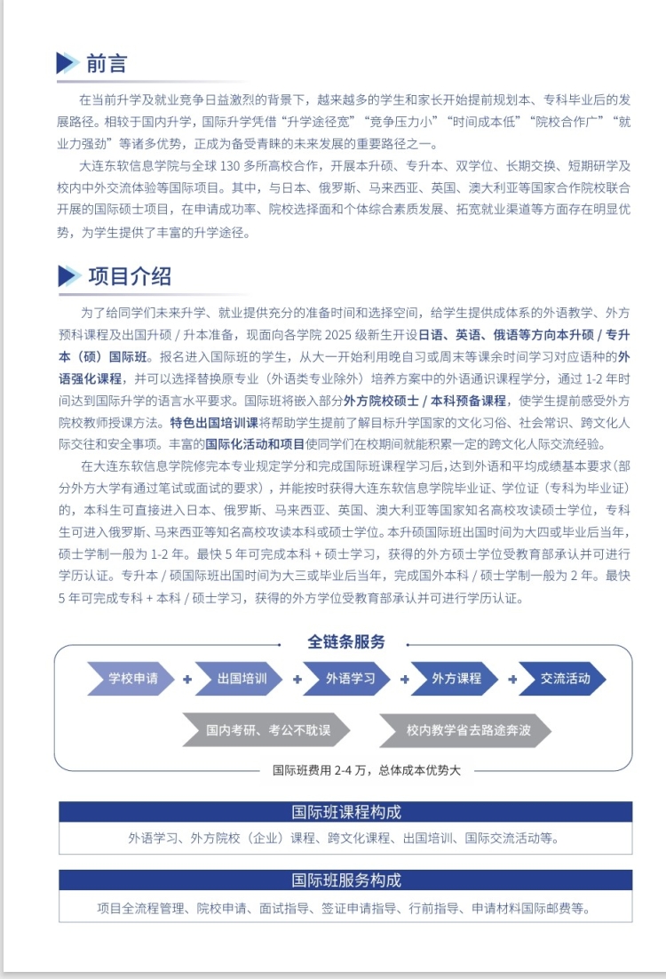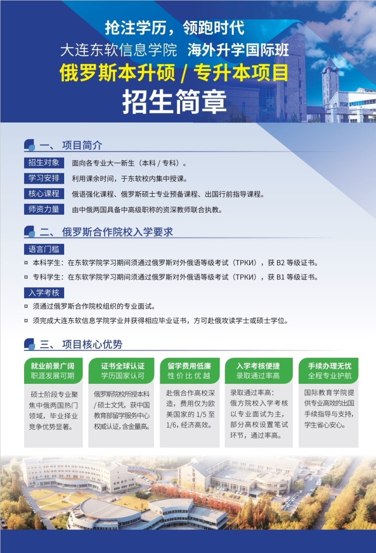 为助力同学们未来在升学与就业中拥有更充裕的准备时间与更广阔的选择空间,学校系统开设外语教学课程、外方预科课程,并提供出国升硕/升本的全程准备支持。现面向各学院2025级新生开设日语、英语、俄语方向本升硕/专升本(硕)国际班。项目内学生在大连东软信息学院修完本专业规定学分和完成国际班课程学习后,达到国外院校对外语和平均成绩的基本要求(部分外方院校还需通过笔试或面试),并按时获得大连东软信息学院毕业证与学位证(专科生为毕业证),则本科生可申请进入日本、俄罗斯、马来西亚、英国、澳大利亚等国家知名高校攻读硕士学位;专科生可申请进入俄罗斯、马来西亚等国家的知名高校攻读本科或硕士学位。