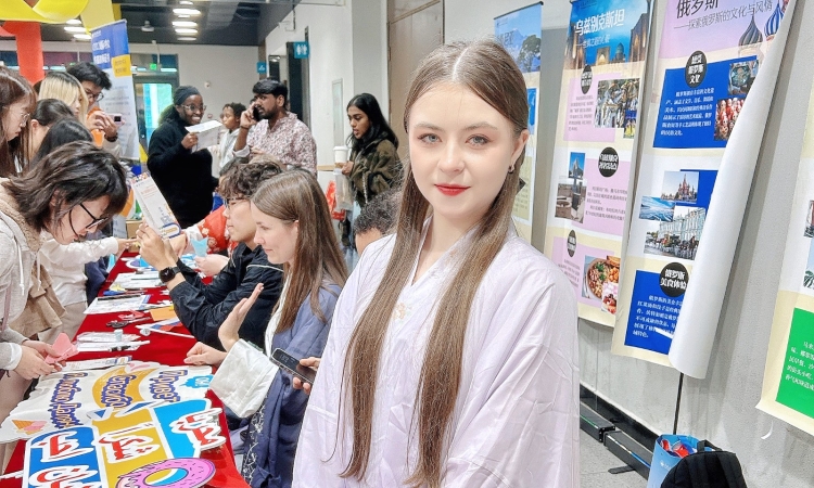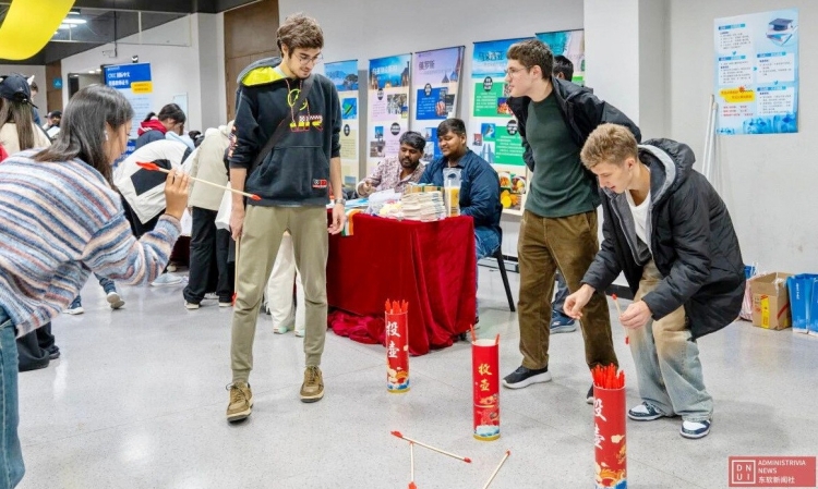 在文化节的开场表演中,国际教育学院的俄罗斯留学生与坦桑尼亚留学生分别表演了极具民族特色的歌舞,精彩演出赢得阵阵掌声,迅速点燃现场的国际化氛围。场馆内,各国文化展位似“世界角落”。传统手工艺品与美食展位香气四溢,其中俄罗斯留学生的“甜蜜小摊”格外引人注目,他们制作的俄罗斯传统甜点广受喜爱。留学生们不仅展示家乡文化,还主动体验中国文化。在“传统游戏角”,他们兴致勃勃地玩起“投壶”,还热情地邀请中国学生一同参与,切磋技艺。汉服体验区更是热闹非凡,中外学生共同换上典雅的汉服,衣袂飘飘间仿佛穿越时空,引得众人驻足拍照,欢声笑语不断。活动现场更变身“小联合国语言课堂”。各国留学生自发当起“小老师”,教起各国母语。特别的发音、打结的舌头、认真的学生、真挚的笑脸……一切都是那么亲切自然。